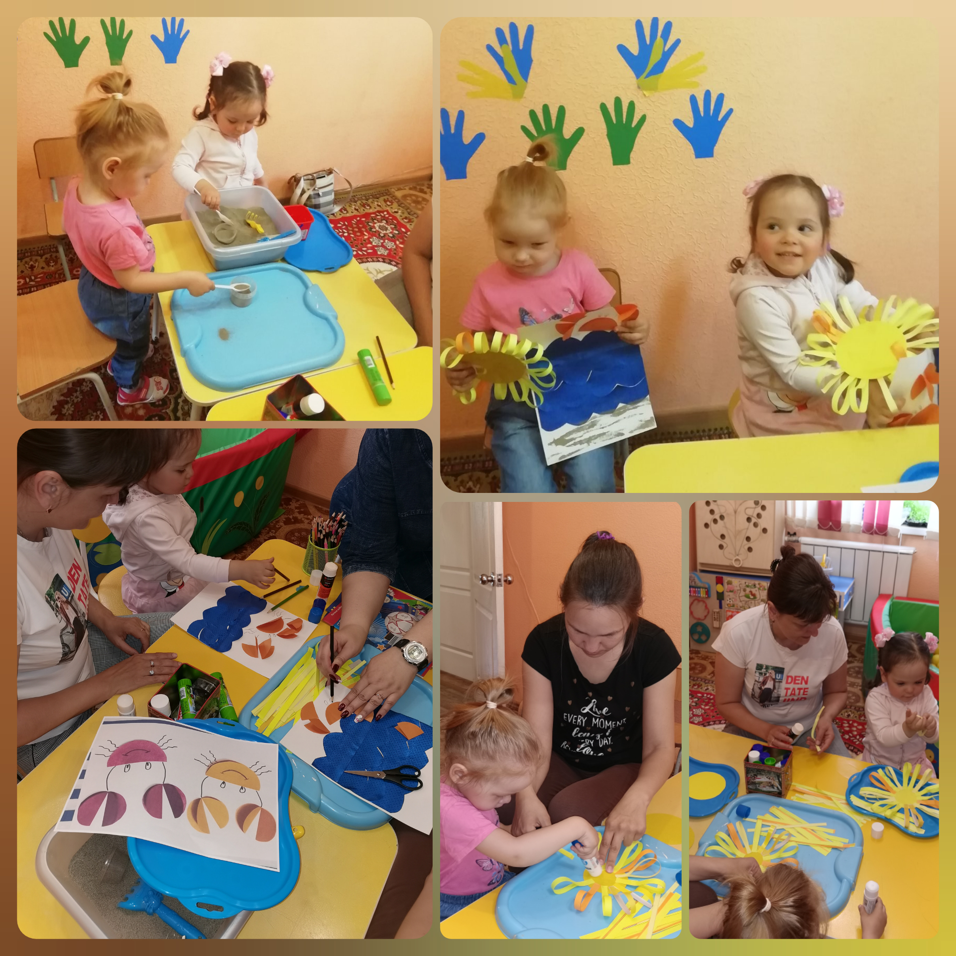 Каждую неделю в службе ранней помощи помощи проходят групповые занятия. 18 мая, наши малыши сделали Солнышко и Крабика с помощью аппликации из цветной бумаги и песка. Занятие было очень полезным и увлекательным.