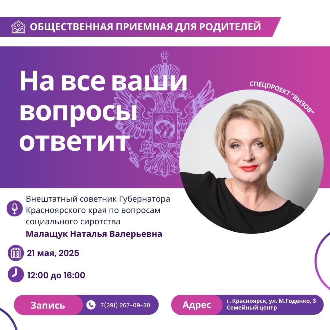 21 мая на базе Центра семьи «Октябрьский» состоится вторая встреча советника Губернатора Красноярского края по вопросам социального сиротства Малащук Натальи Валерьевны с семьями в рамках спецпроекта «Вызов».