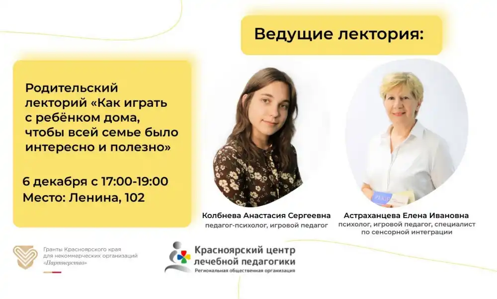 Уважаемые мамы и папы, РОО Красноярский центр лечебной педагогики приглашает вас 6 декабря на первую встречу в рамках родительского лектория по проекту «Компетентная мама-успешный малыш».